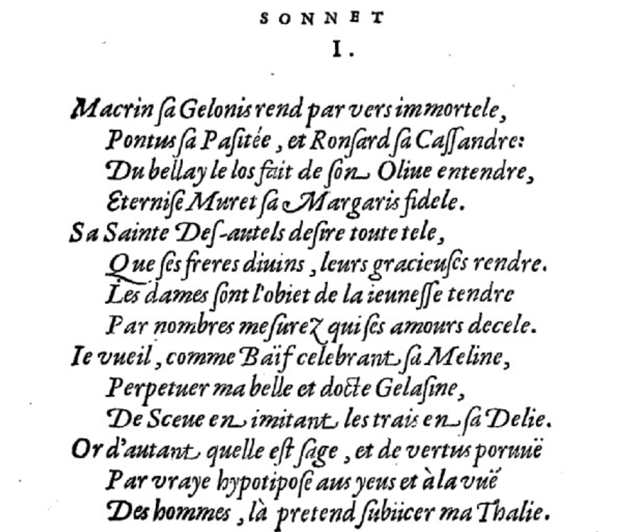 Outre Les Amours de Pierre de Ronsard (1552) dans lesquelles il magnifie Cassandre, L’Olive de Joachim du Bellay (1549-1550) et la Délie de Maurice Scève (1544), fort célèbres, on peut détailler les références présentes dans le texte : Pontus du Tyard chante Pasithée dans les Erreurs amoureuses (1549) ; Marc-Antoine Muret célèbre, entre autres, une Margaris dans ses Jeunesses (Juvenilia) ; Guillaume des Autels loue sa Sainte dans l’Amoureux repos (1553) ; enfin, Jean-Antoine de Baïf compose les Amours de Méline en 1552.