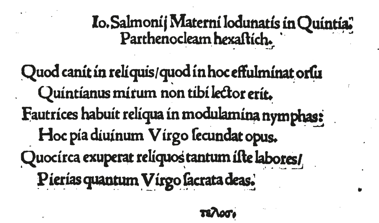 Io<annis> Salmonij Materni Lodunatis in Quintia<ni> Parthenocleam hexastich<on>.