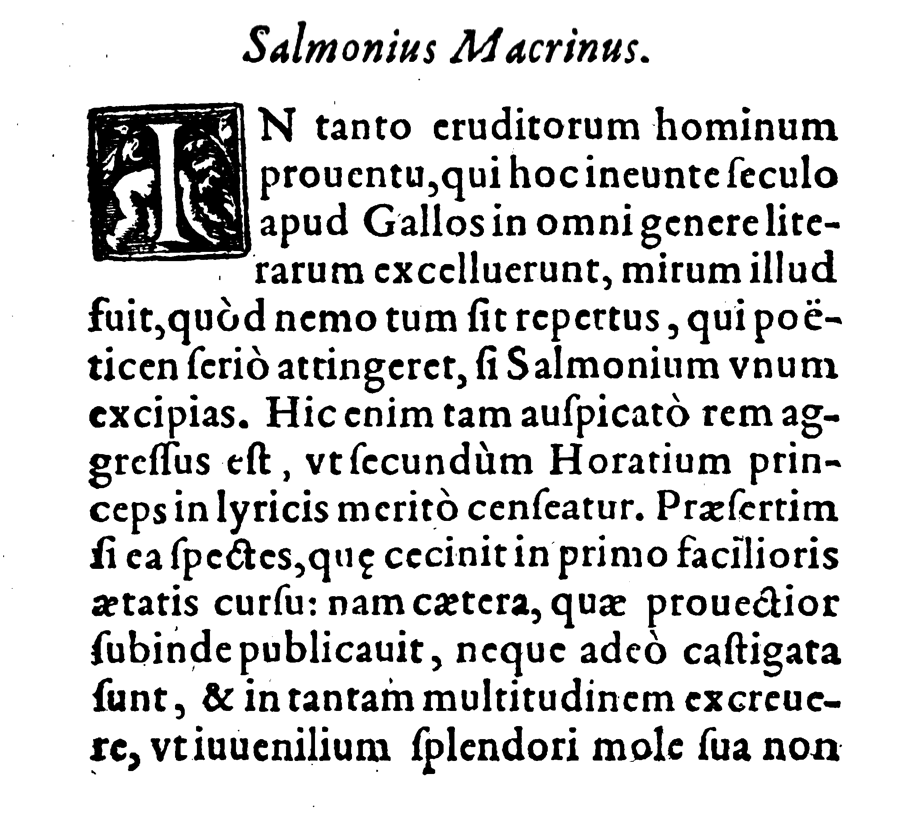 IN tanto eruditorum hominum prouentu, qui hoc ineunte seculo apud Gallos in omni genere literarum excelluerunt, mirum illud fuit quod nemo tum sit repertus, qui poeticen serio attingeret, si Salmonium unum excipias. Hic enim tam auspicato rem agressus est, ut secundum Horatium princeps in lyricis merito censeatur. Praesertim si ea spectes, quae cecinit in primo facilioris aetatis cursu : nam caetera, quae prouectior subinde publicauit, neque adeo castigata sunt, & in tantam multitudinem excreuere, ut iuuenilium splendori mole sua non parum officiant. Natus est Iulioduni, quod oppidum nobis quoque natale in Pictonum Turonumque et Andium finibus aere salubri foecundoque solo positum a Iulio Caesare conditore suo sic appellatum maiores nobis tradiderunt. Cumque ad futuram frugem praeclarissima eius indoles a puero iam effloresceret, ne spes illa praecideretur, a parentibus (quorum alioqui tenues erant fortunae) in Parisiensem academiam eo tempore missus est, cum Iacobus Faber meliores omnes disciplinas magna nominis celebritate profiteretur. A cuius educatione factus doctior Claudio Tendae Comiti et Honorato eius fratri Renati Sabaudi filiis erudiendis continuo praefectus est : unde primus illi patuit ad principis aulam aditus. Adhaesit inde Bellaiis fratribus liberalissimis Musarum patronis : quos et reliquos itam aulae proceres ipsumque Regem dum lyricorum suorum blanditiis demulcet ac demeretur, diu multumque celebris et gratiosus in aulae comitatu floruit. Donec vitae coelibis pariter et aulicae pertaesus uxorem duxit ciuem suam splendido loco puellam : cuius pios & concessos amores insigni pudoris exemplo decantauit, mortuamque suis et amicorum uersibus aeternae posteritatis memoriae commendauit. Susceptis ex ea utriusque sexus liberis, quorum natu maximus Charilaus, patre non inferior, illustrissimae principi Catharinae Borboniae Regis sorori praeceptor datus Lutetiae in ipso aetatis flore una cum Admiralio caesus est : cum Salmonius pater anno MDLVII domi suae senio plane confectus occidisset.