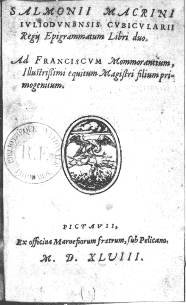 Les Epigrammatum libri duo de Jean Salmon Macrin ont paru à Poitiers en 1548 chez les Frères de Marnef (Fratres Marnefii).