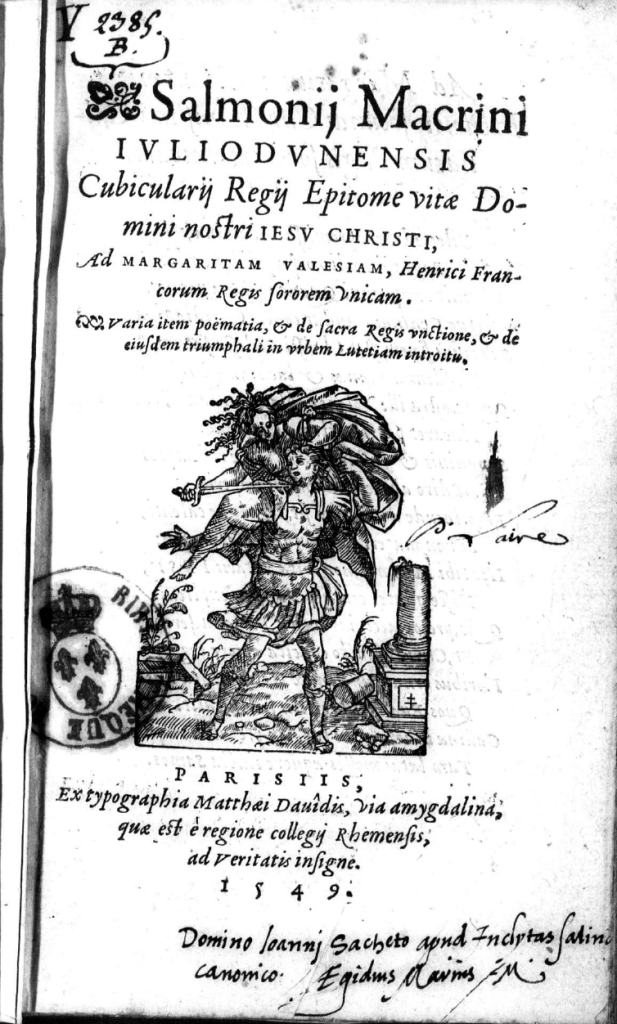 L’Epitome vitae Domini nostri Iesu Christi et les Varia item Poematia de Jean Salmon Macrin ont paru à Paris en 1549 chez Mathieu David (Matthaeus David).